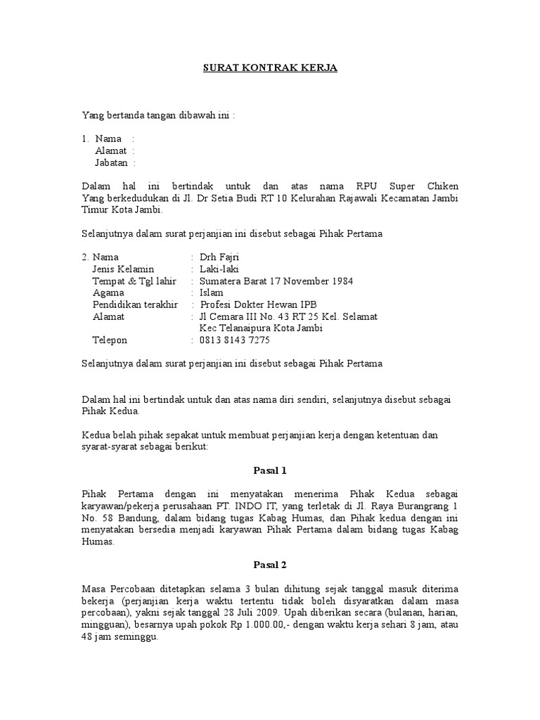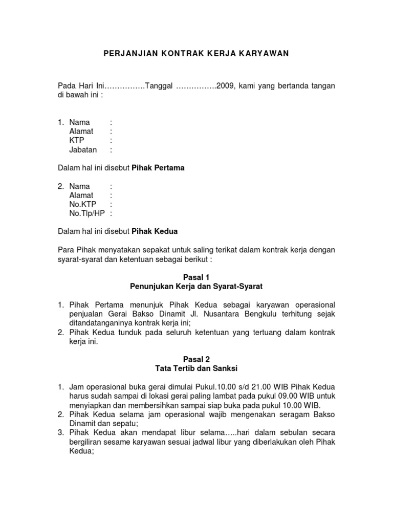 Contoh Kontrak Kerja Karyawan Dalam sistem kerja di Indonesia pihak perusahaan memiliki wewenang untuk memberikan sistem kontrak dan tetap pada karyawannyaNah untuk artikel berikut kami akan membahas secara khusus mengenai sistem kerja kontrak di Indonesia. Demikian surat keterangan ini kami buat dengan sebenarnya dan agar. Oleh karena itu Anda perlu berhati-hati dalam membuat kontrak kerja dengan karyawan.
